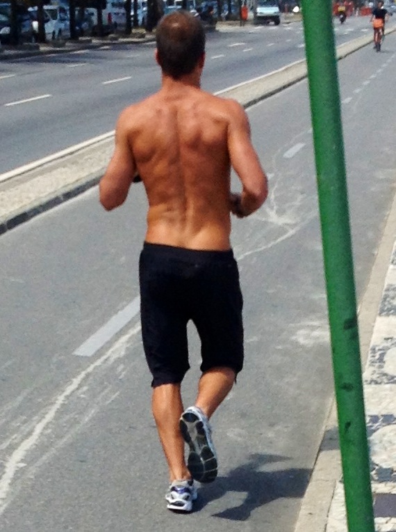 I began jogging from Posto 5. My plan was to take it easy and maybe do 2.5km to Posto 8 in Ipanema. As soon as I started in the near horizon I caught sight of a guy with his top off. He was about 15 meters ahead of me. It looked like he had a muscular back firm legs and a nice round arse. I believed he would have a six pack and nice pecs.