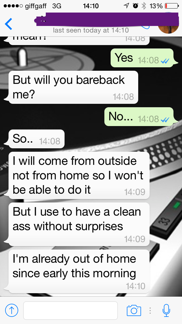 Let me set the scene: This guy from Spain contacted me on Grindr in March, saying he would be in London in June for business. We exchanged pictures and agreed we would be a good fit in bed. We exchanged numbers and our conversation moved to Whatsapp. He arrives in London and we arrange a provisional time to meet and seal the deal. Below is the interesting part of the conversation. Please note English is not his first language, but he clearly communicated his thoughts about douching.