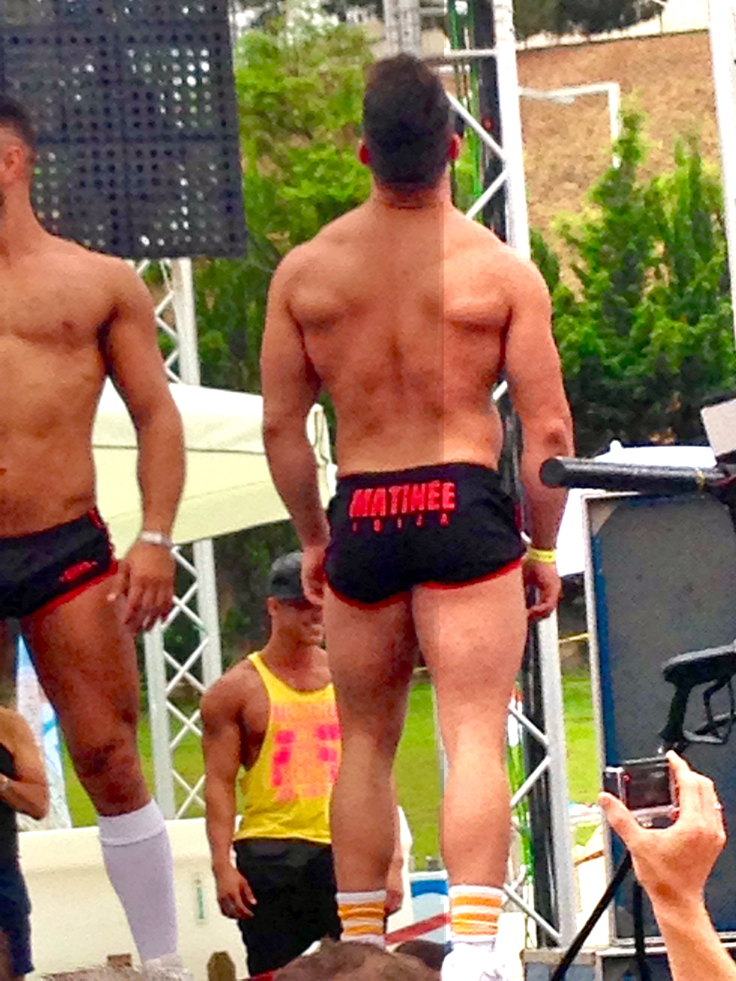 The topless Go-go dancers on the stage were within the body type range of athletic/defined to big muscular/defined. Their dance moves were easy to follow. “Left leg forward left leg back. Right leg forward, right leg back; left bicep curl; right bicep curl. Then after every five or so repetitions they did the discus thrower spin then back to the leg routine. Simple choreography. Not too demanding and suitable for the music that, let’s face it doesn’t require any complex choreography. But who cares – This wasn’t So you think you can dance.