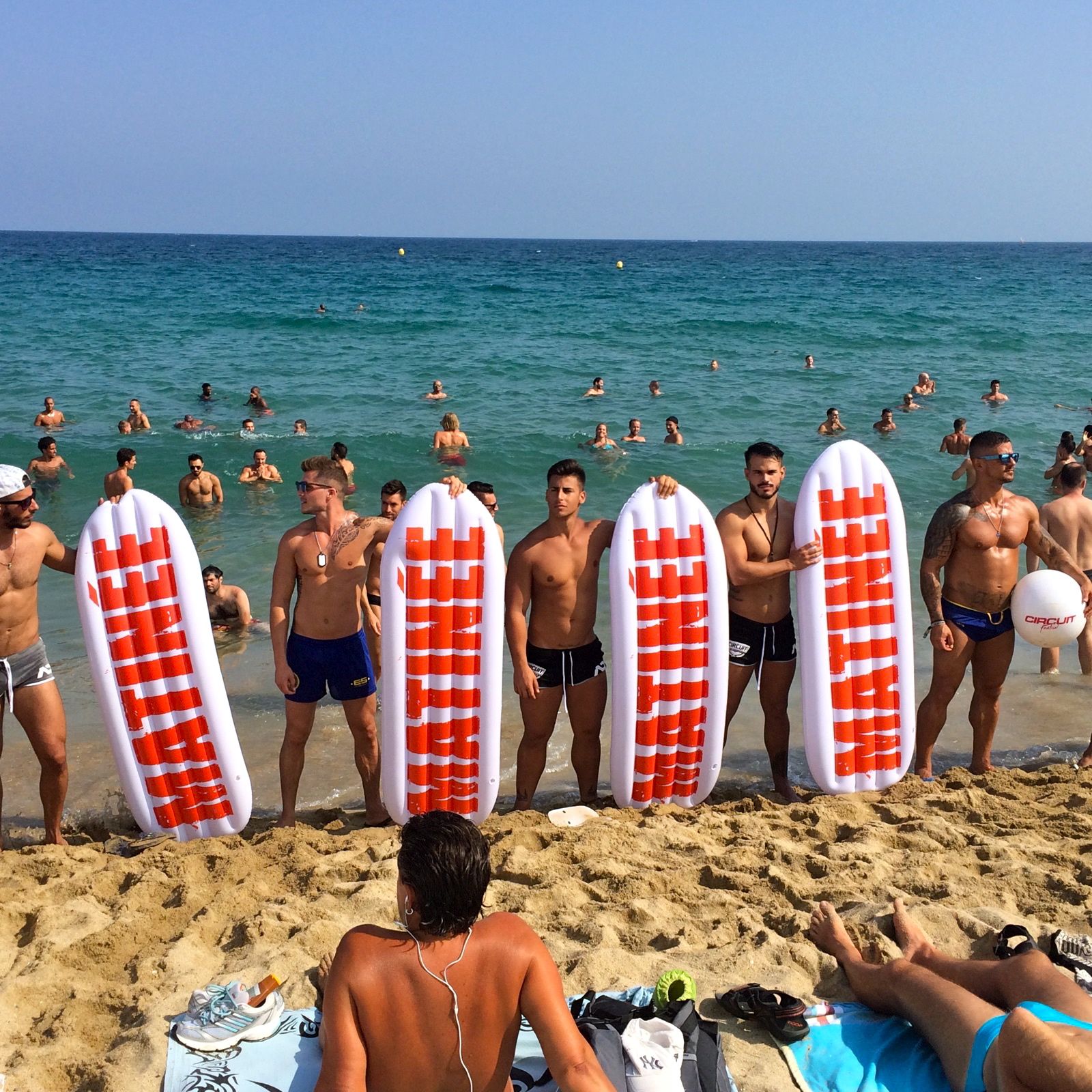 The nudist part of Platja de la Mar Bella beach is the gay beach. This is where everyone hangs out during “downtime”. Usually busy all day everyday  during the Circuit festival, except on the Pool party and Water park main event days.