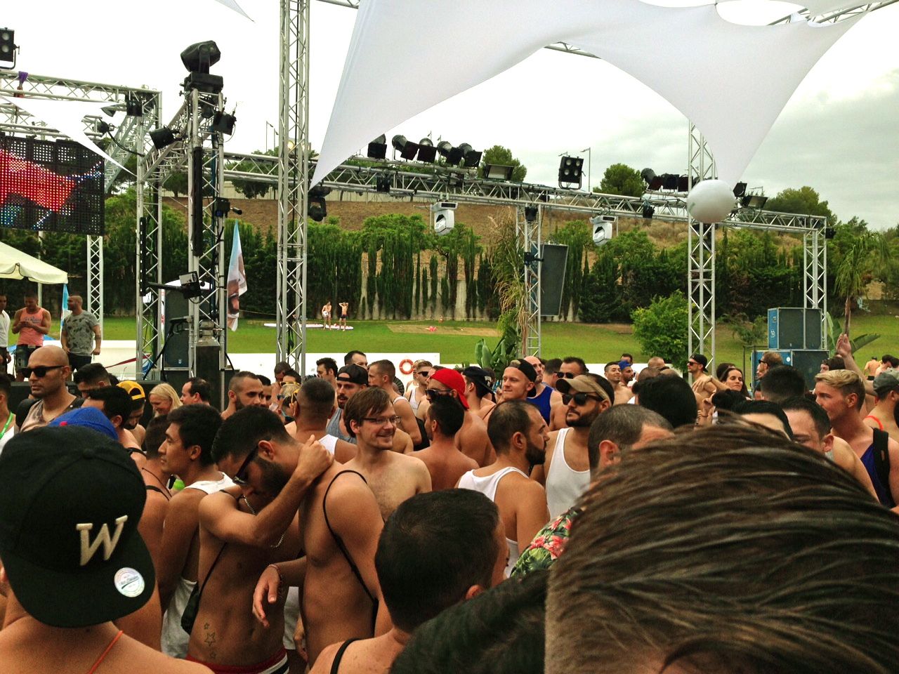 We arrived at the venue, which was a sports complex with a large outdoor swimming pool. We went through some security checks not dissimilar to those carried out at airports. Only this time, we were not asked for our passports and everyone was subjected to a Quasi-cavity search to check for drugs. The security guy patted my balls down and ran his fingers along my ass crack. I know the Spanish can be a bit touchy feely, but I thought that was a bit personal, especially since he didn’t say “Hola” first.