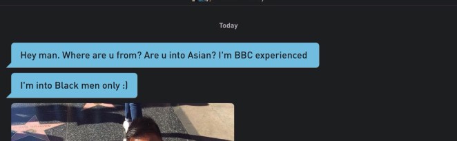 On one hand, the PC brigade say don’t mention race exclusions on your profile, that it is demoralising for the excluded race, but do not say that people of the excluded race, should not use their race to try and get laid.